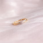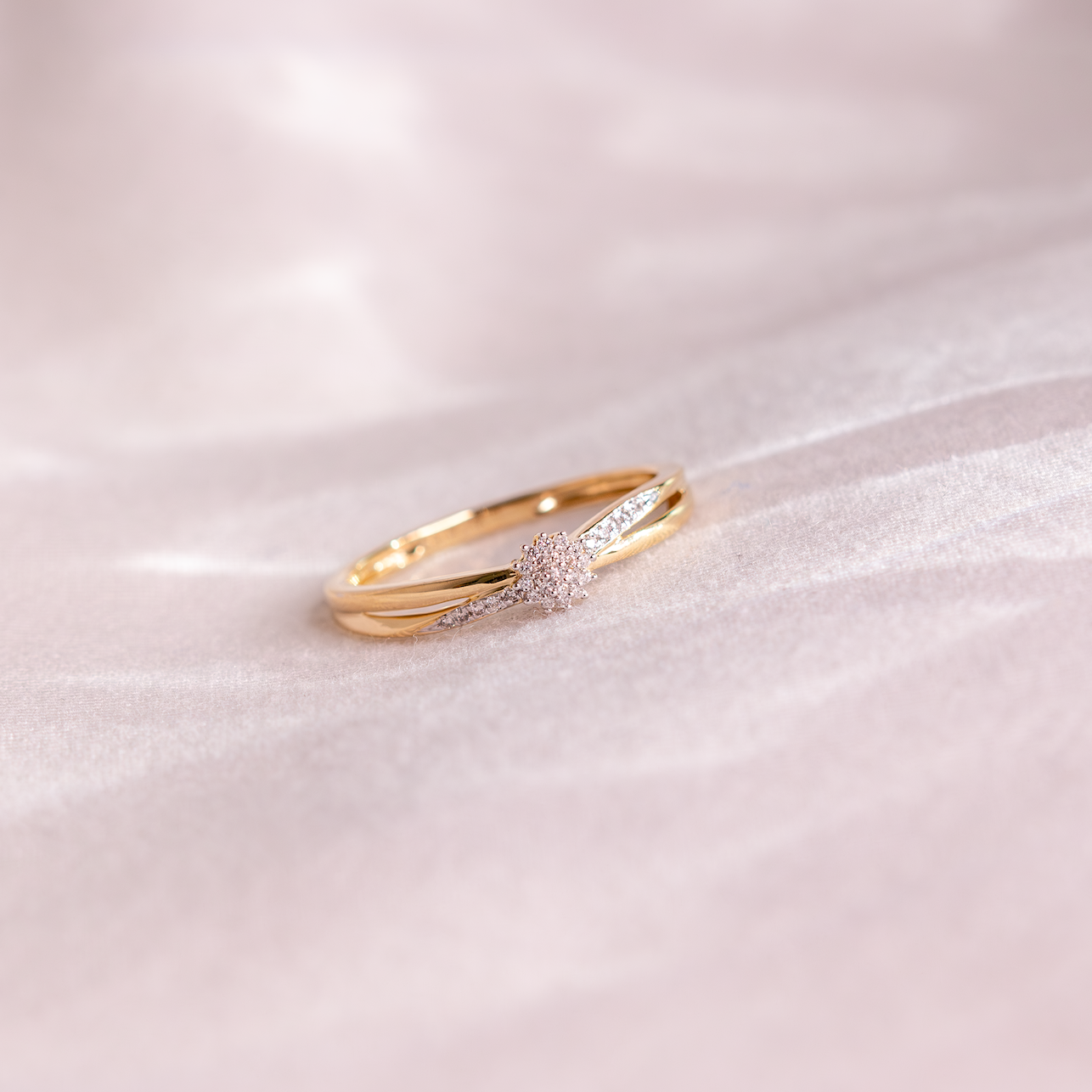 Elegant ring i 14 karat gult eller hvitt gull med en glitrende diamantrosett som blikkfang. Den delte ringskinnen prydet med små diamanter gir et eksklusivt og balansert uttrykk. Et smykke som kombinerer klassisk design med moderne detaljer og tilfører et stilfullt preg til både hverdags og fest. Perfekt for deg som ønsker et tidløst uttrykk med litt ekstra glans.
