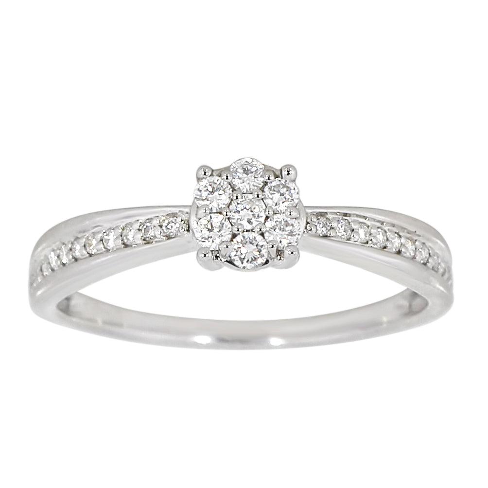 Elegant diamantring i 14 karat gult eller hvitt gull, med en rund senterdel satt med brillantslipte diamanter i klynge. De glitrende diamantene fortsetter nedover ringskinnen og gir et luksuriøst uttrykk med klassisk preg. En tidløs ring som passer perfekt som forlovelsesring eller som et glitrende smykke til spesielle anledninger.