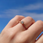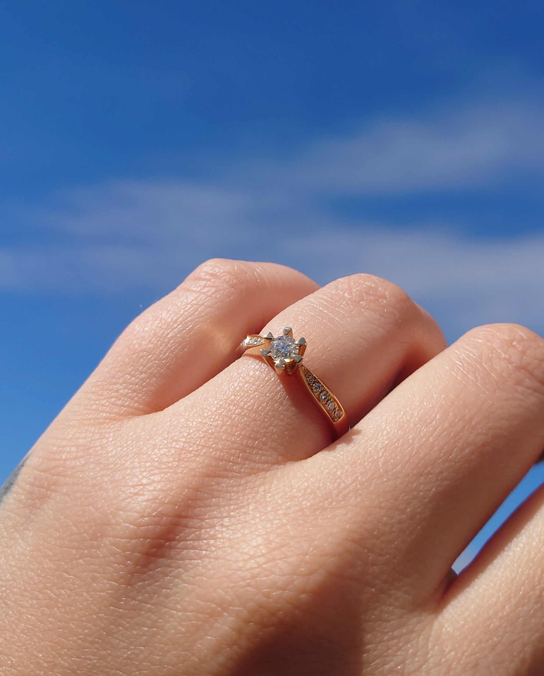 Elegant ring i gult gull med en briljantslipt midtdiamant festet i en markant seksklørt innfatning, kombinert med små diamanter som glitrer langs begge sider av ringskinnen. Designet gir en fin balanse mellom klassisk stil og eksklusivitet, perfekt som forlovelsesring eller en gave som skal vare livet ut.