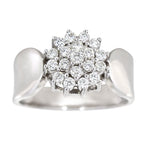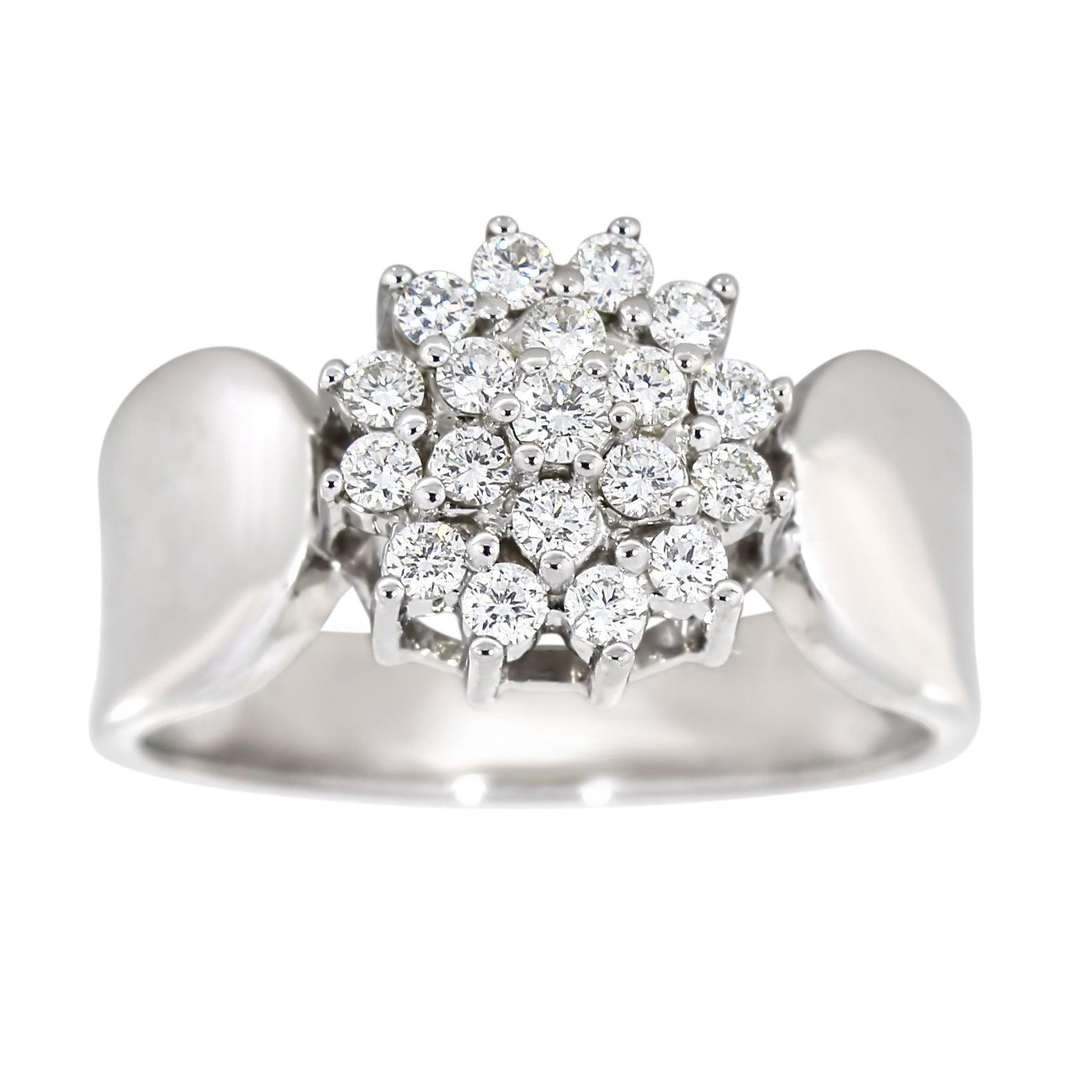 Denne diamantringen i 14 karat gull skiller seg ut med en kompakt rosett topp, der briljantslipte diamanter er plassert tett i flere nivåer for maksimal glans. Det brede båndet gir ringen et kraftfullt preg og sørger for god balanse til den detaljerte toppen. Modellen leveres enten i gult eller hvitt gull, slik at du kan velge den utgaven som passer best til din stil.
