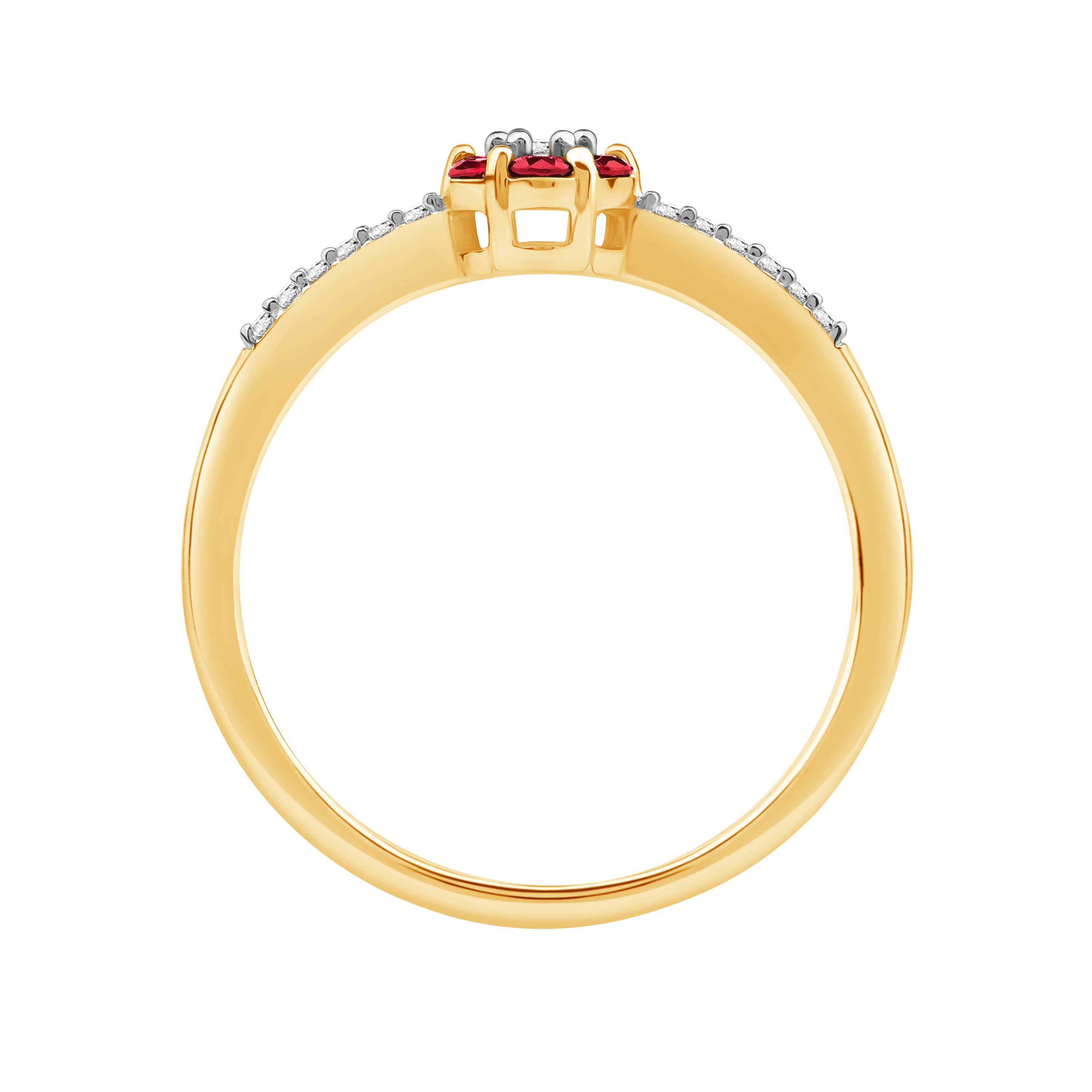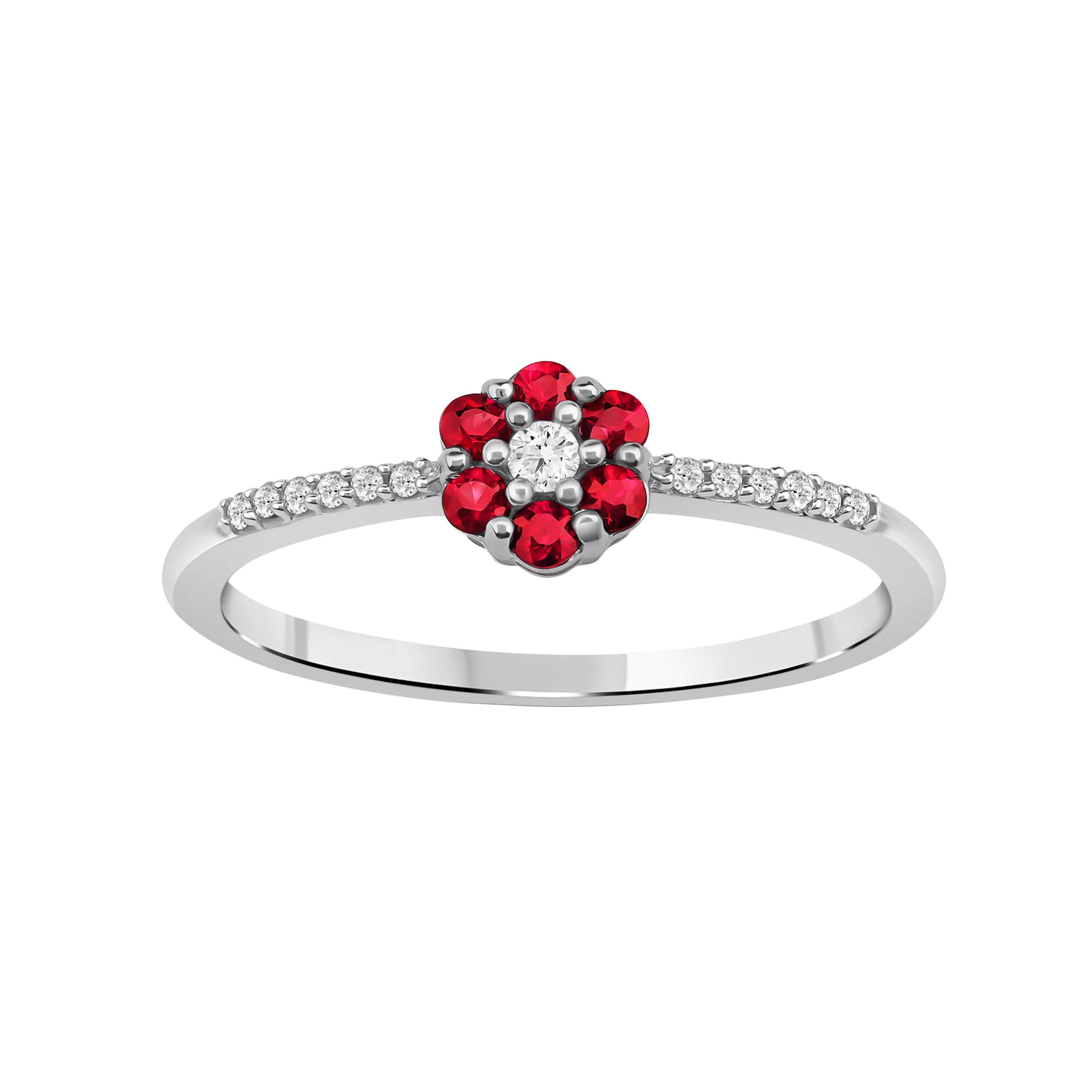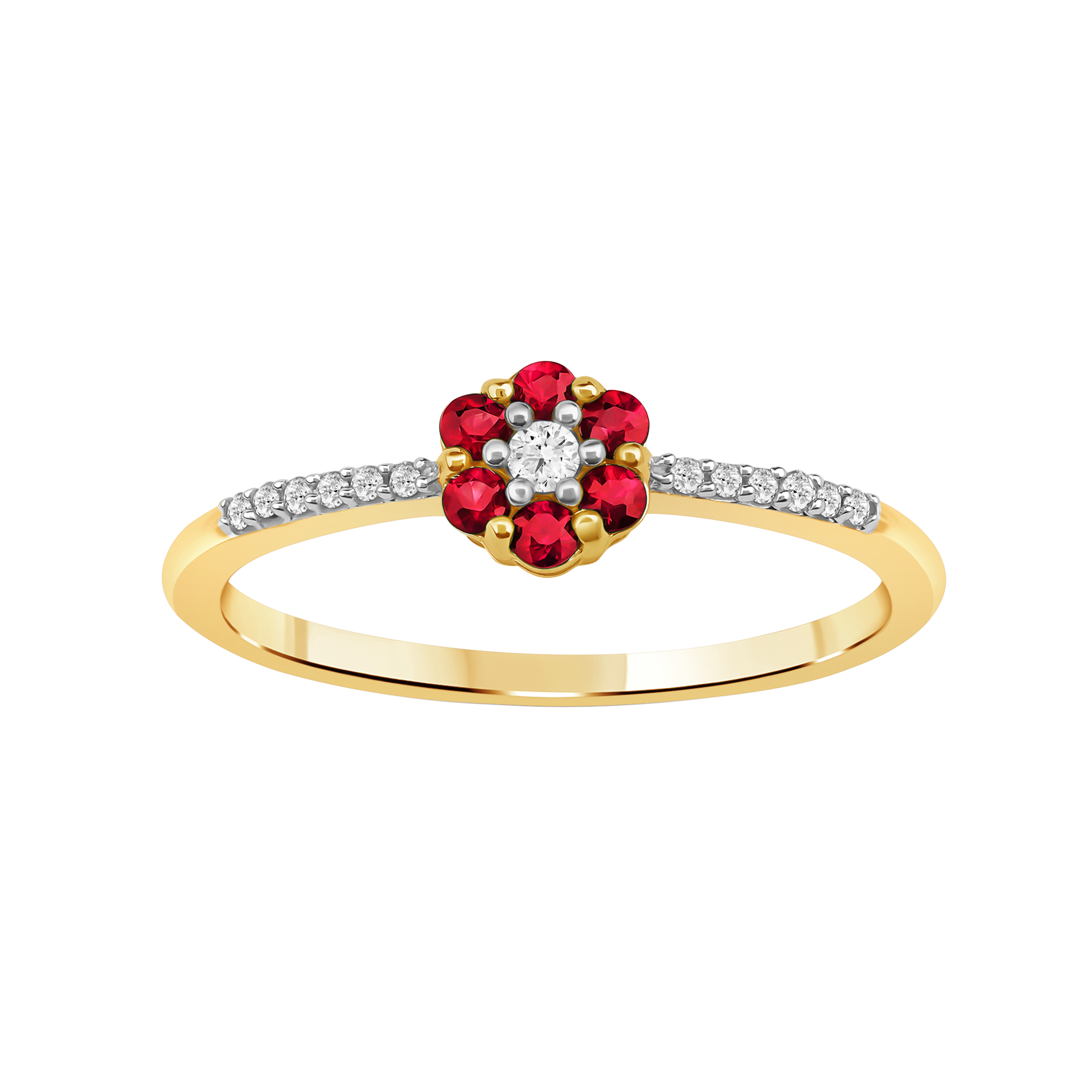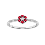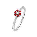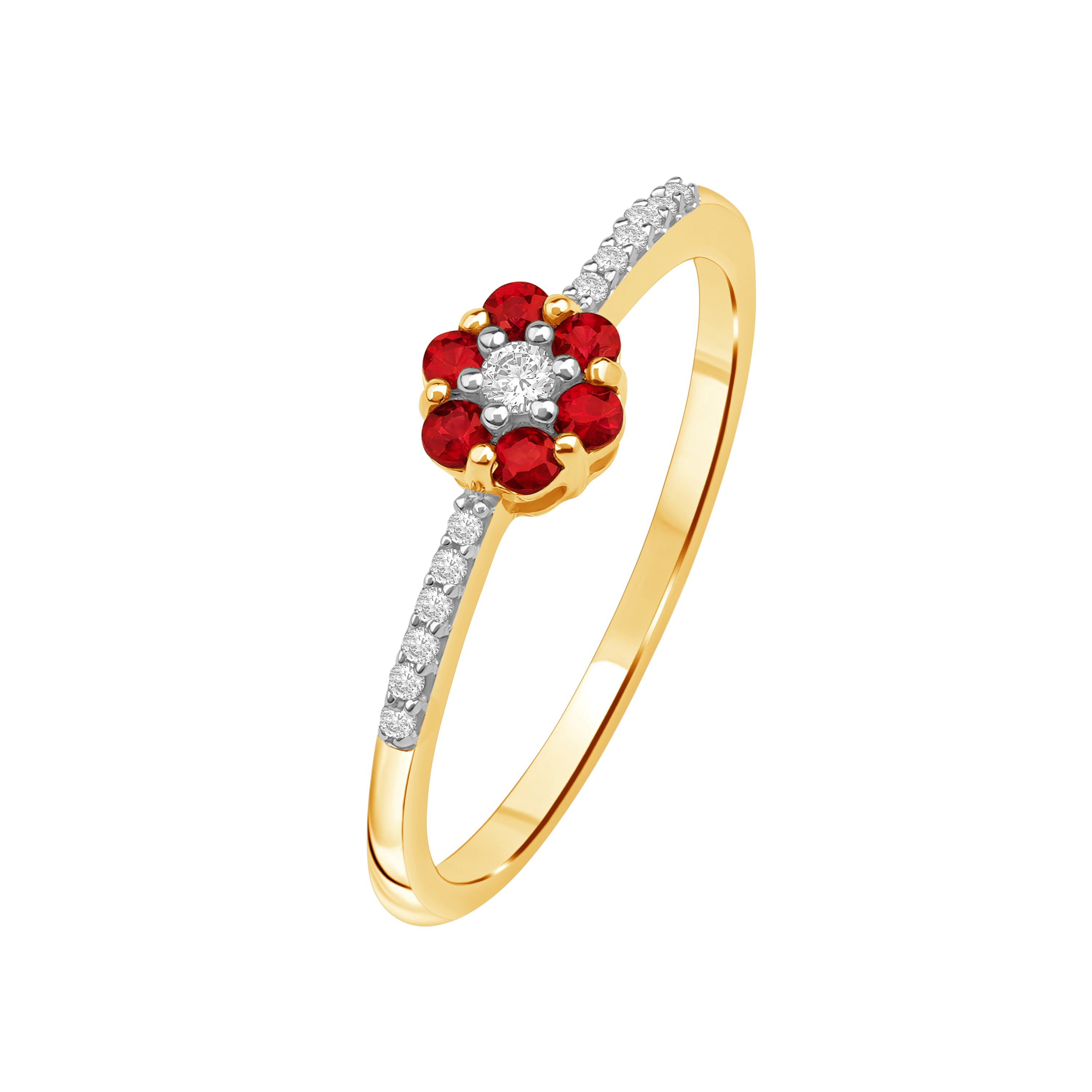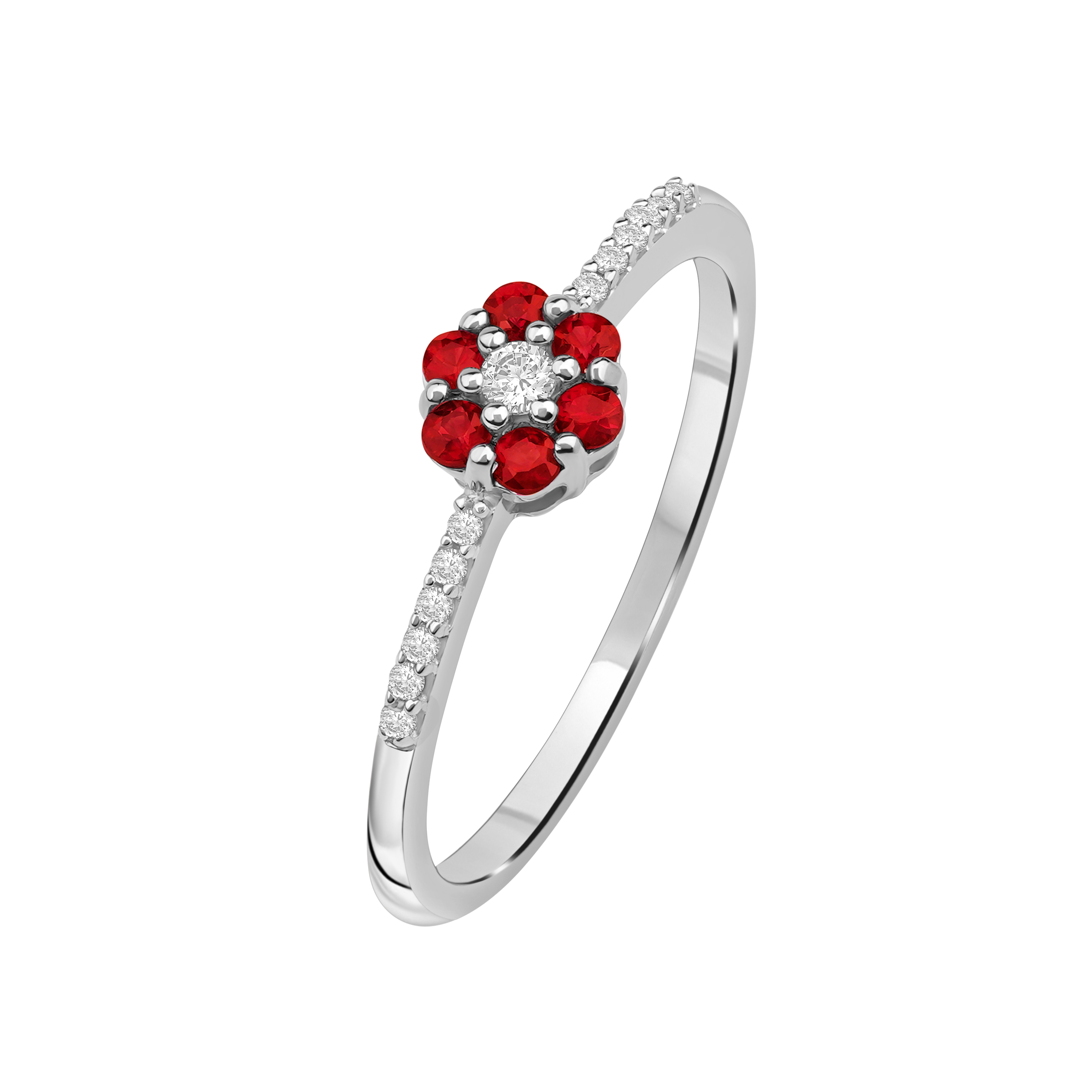 Denne ringen kombinerer klassisk eleganse med varme toner. Sentrert i et blomstermotiv ligger 0.07 ct glitrende diamanter, omkranset av 0.19 ct intense rubiner som gir ringen en levende og uttrykksfull karakter. Detaljert utforming og en smal ringskinne sørger for både komfort og stil. Finnes i gult eller hvitt gull.