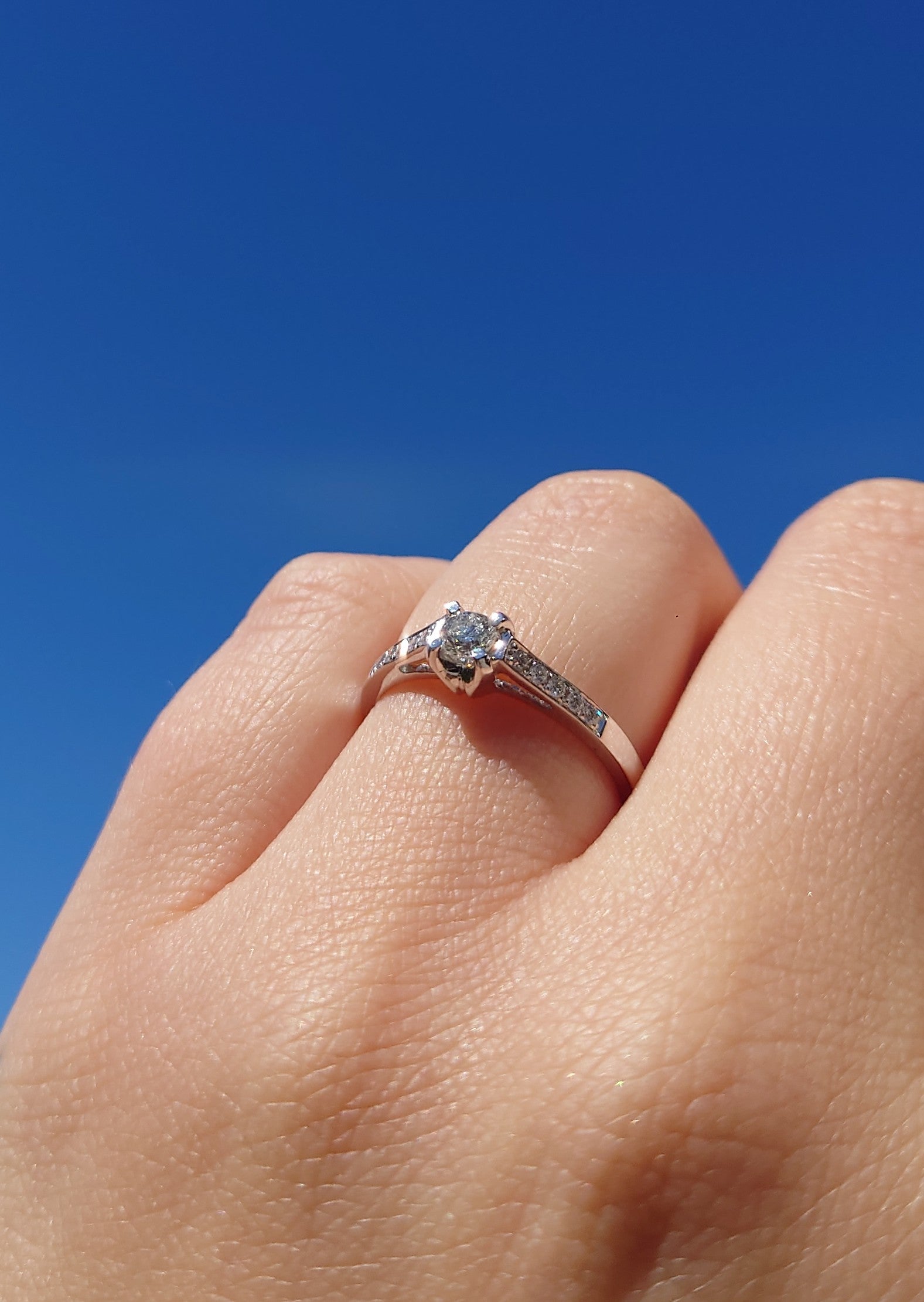 Denne ringen i hvitt gull har en elegant fireklørsinnfatning med en midtdiamant på 0,20 ct, flankert av glitrende sidestener langs ringskinnen. Den balanserer klassisk design med moderne detaljer, og har blitt et populært valg til både forlovelser og minneverdige gaver. En tidløs modell som fremhever det spesielle i øyeblikket.