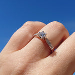 Tidløs og raffinert ring i hvitt gull med en sentral briljantslipt diamant i en markant seksklørt innfatning. Små diamanter er elegant innfattet i ringskinnen på hver side, noe som gir ekstra glans og dybde til helheten. Et klassisk valg som passer perfekt som forlovelsesring eller en spesiell gave med varig verdi.