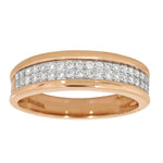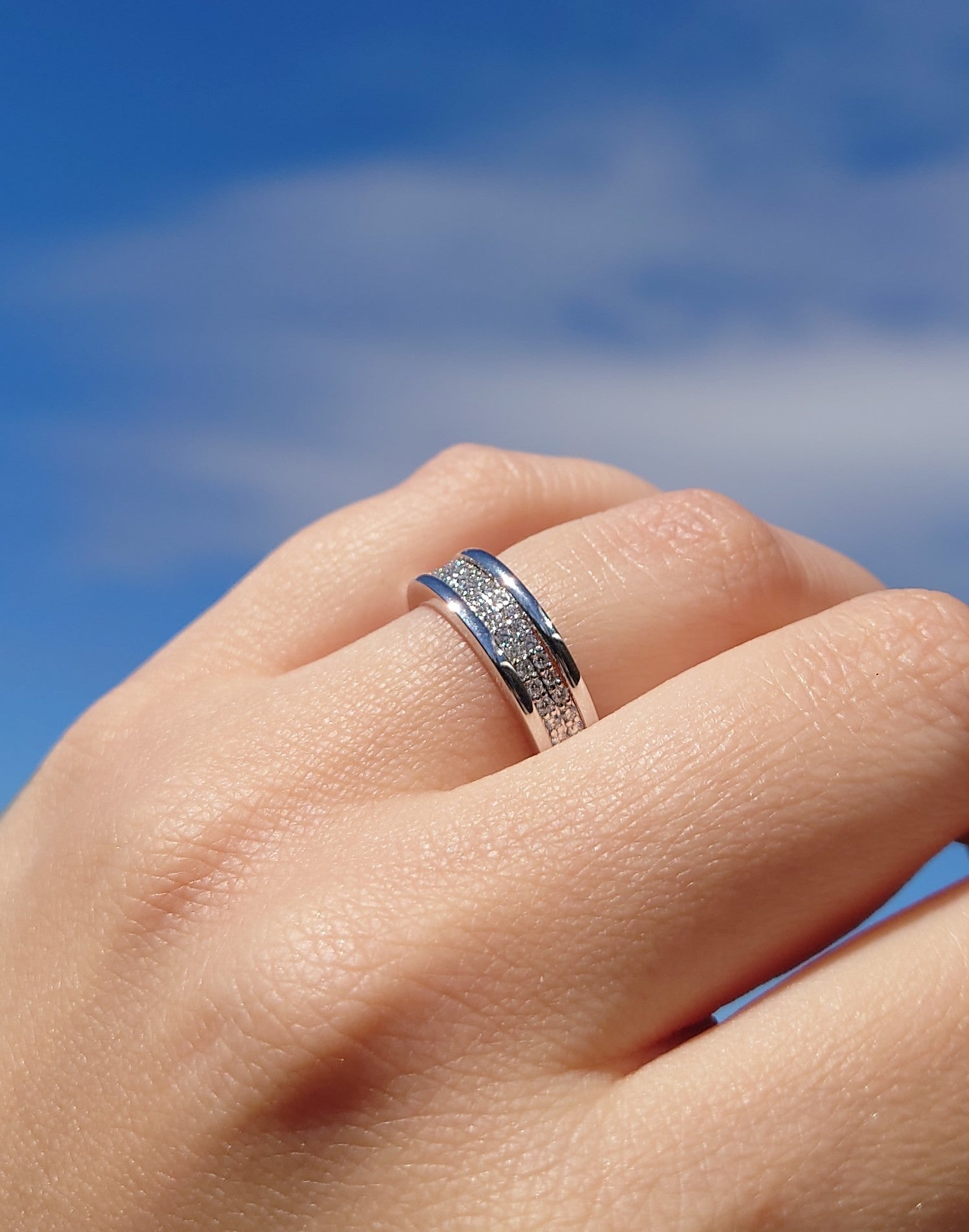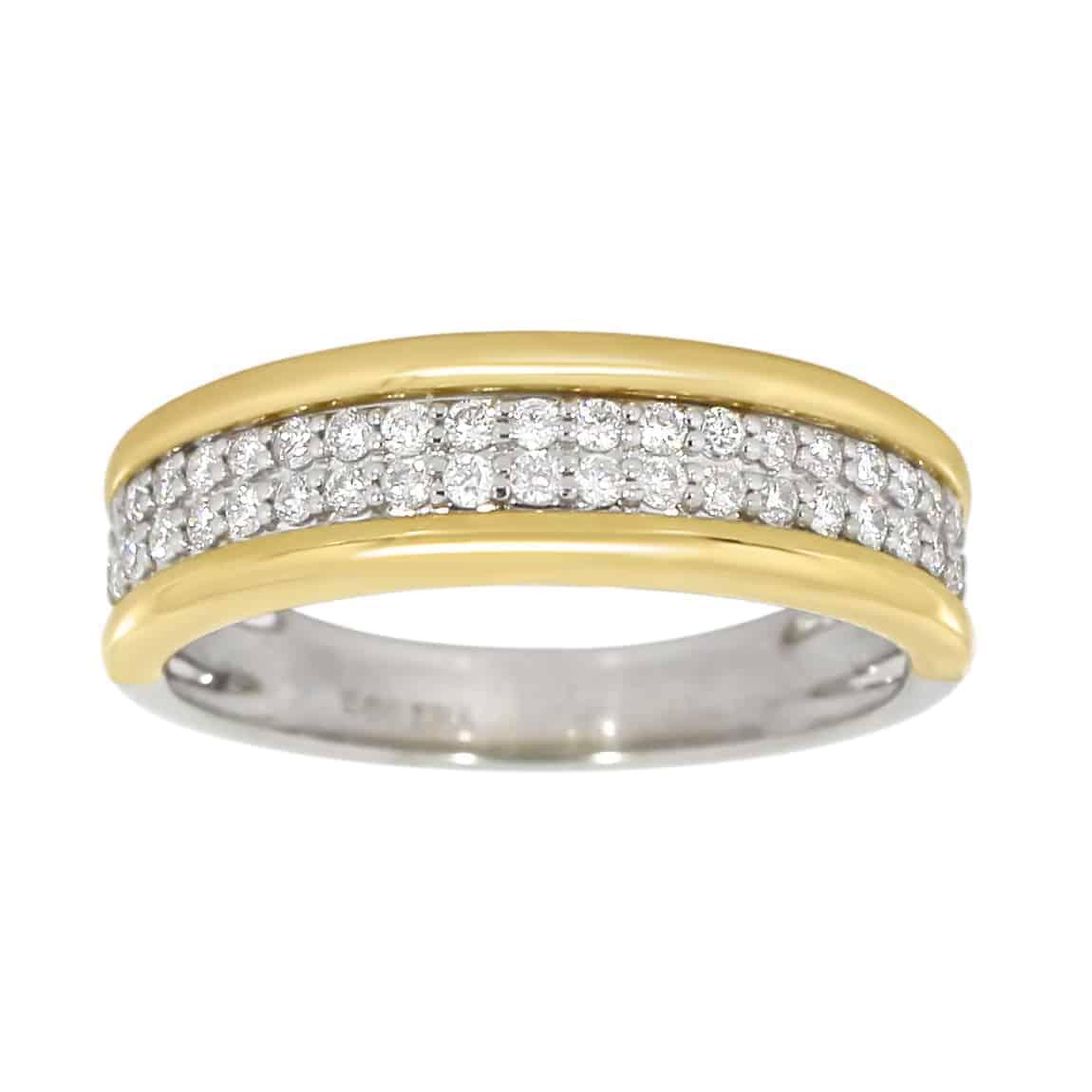 Elegant ring i eksklusivt gull, tilgjengelig i hvitt, gult eller rosé gull. Midtbåndet er vakkert besatt med to parallelle rekker av glitrende diamanter som til sammen utgjør 0.35 ct. Den blankpolerte overflaten skaper en vakker kontrast til diamantrekken og gir et moderne og luksuriøst uttrykk. Perfekt som bryllupsring, jubileumsgave eller som et tidløst statement-smykke til festlige anledninger. Et smykke som kombinerer høy kvalitet med stilfull design for et varig og elegant uttrykk.