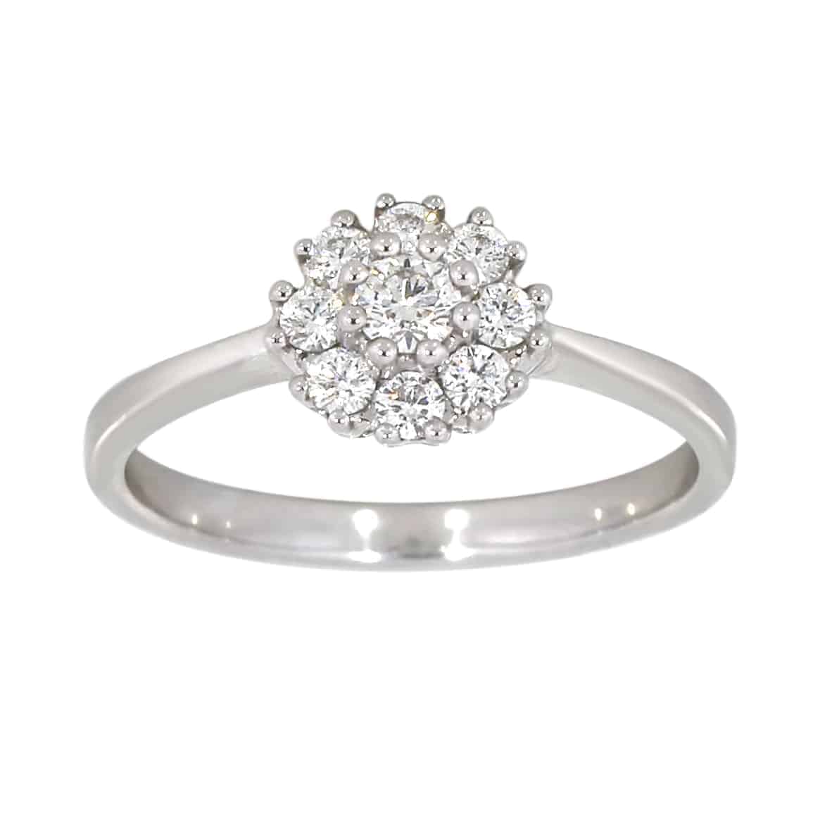 Nydelig diamantring i 14 karat hvitt gull med en blomsterformet klynge av brillantslipte diamanter. Det stramme, men feminine designet gir en vakker balanse mellom klassisk eleganse og moderne glans. Et perfekt valg som forlovelsesring eller som en tidløs gave til deg selv eller en du er glad i