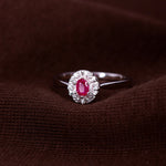 Elegant ring i 14 karat hvitt gull med en strålende rubin som midtpunkt, vakkert omkranset av 0,03 ct briljantslipte diamanter. Den intense røde fargen skaper et iøynefallende og sofistikert uttrykk, mens den delikate utformingen gir ringen et lett og elegant preg. Et smykke som kombinerer tidløs skjønnhet med eksklusivt design.