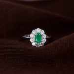 Eksklusiv ring i 14 karat hvitt gull med en dypgrønn smaragd som elegant midtpunkt, omkranset av hele 0,50 ct briljantslipte diamanter. Den livlige smaragden gir ringen et luksuriøst uttrykk, mens de glitrende diamantene skaper en imponerende og tidløs ramme. Et perfekt smykke for deg som søker en iøynefallende ring med klassisk eleganse og utsøkt håndverk.
