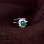 Eksklusiv ring i 14 karat hvitt gull med en dypgrønn smaragd som midtpunkt, omkranset av 0,25 ct briljantslipte diamanter. Den levende grønne fargen gir ringen et luksuriøst og iøynefallende uttrykk, mens diamantene tilfører en strålende glans. Et smykke som kombinerer klassisk eleganse med førsteklasses håndverk, perfekt for både spesielle anledninger og hverdagsbruk.