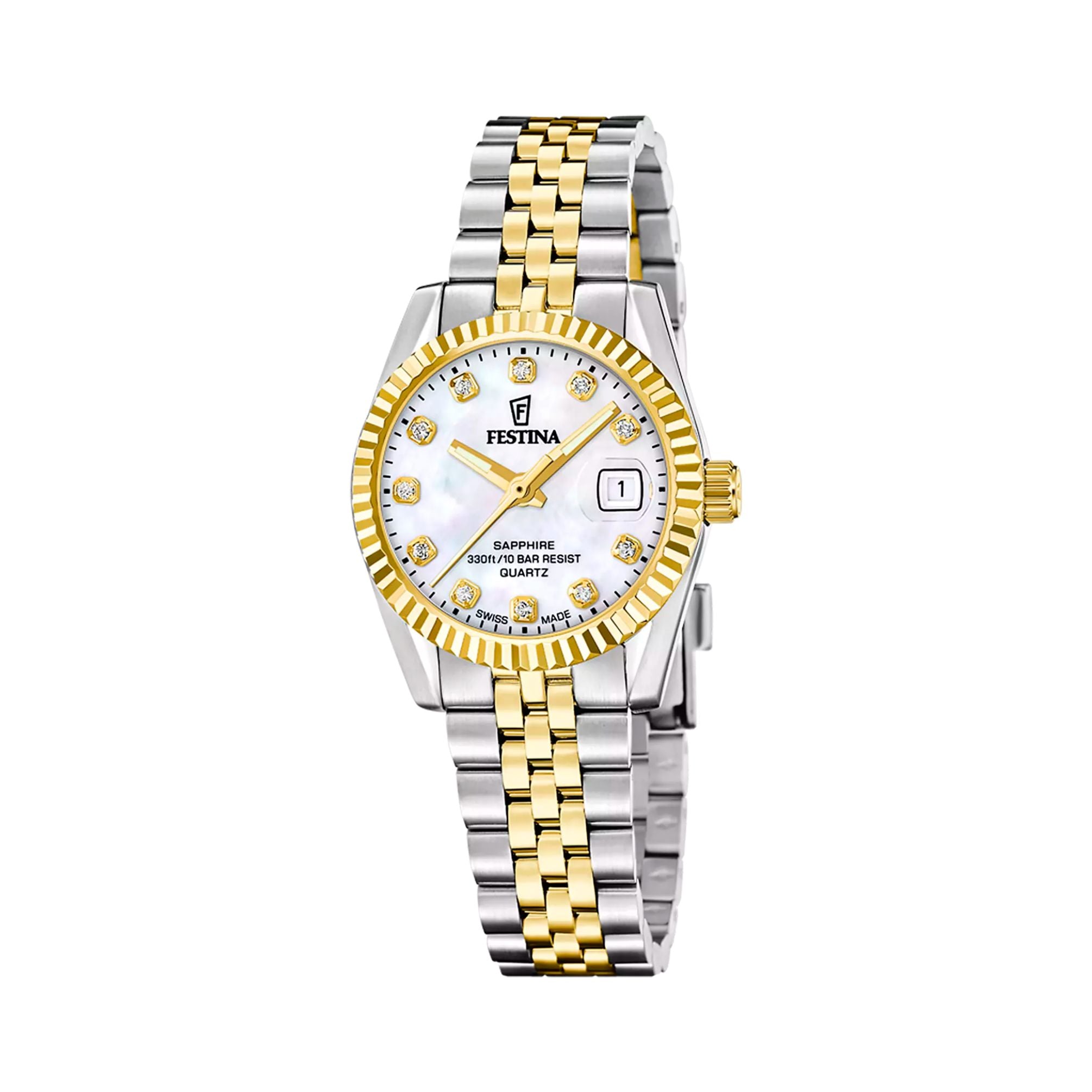 Swiss Made Festina Dameklokke 29mm m/ Safirglass, Perlemorskive og Stener - F20088-1
