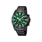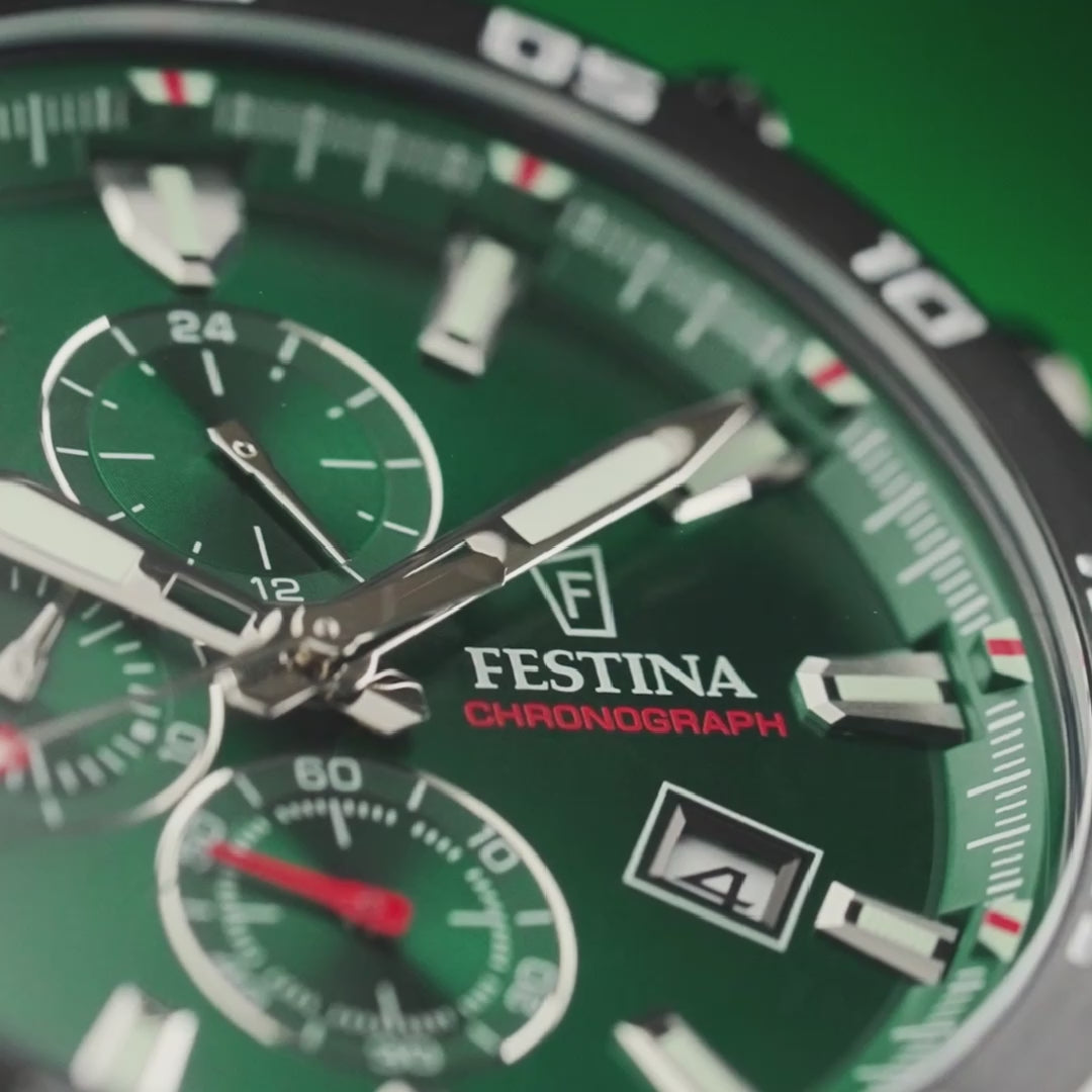 Festina F20735-2 er en kraftfull kronograf med 47 mm kasse i sort utførelse kombinert med en dyp grønn skive som gir et energisk og sportslig uttrykk. De tydelige indeksene og markerte viserne sørger for god lesbarhet, mens kronograf-funksjonen gir presis tidtaking i aktiv bruk. Klokken drives av et pålitelig quartz-urverk og er beskyttet av mineralglass som tåler daglig bruk. Med 20 ATM vanntetthet er dette en modell utviklet for høy aktivitet og robuste omgivelser.