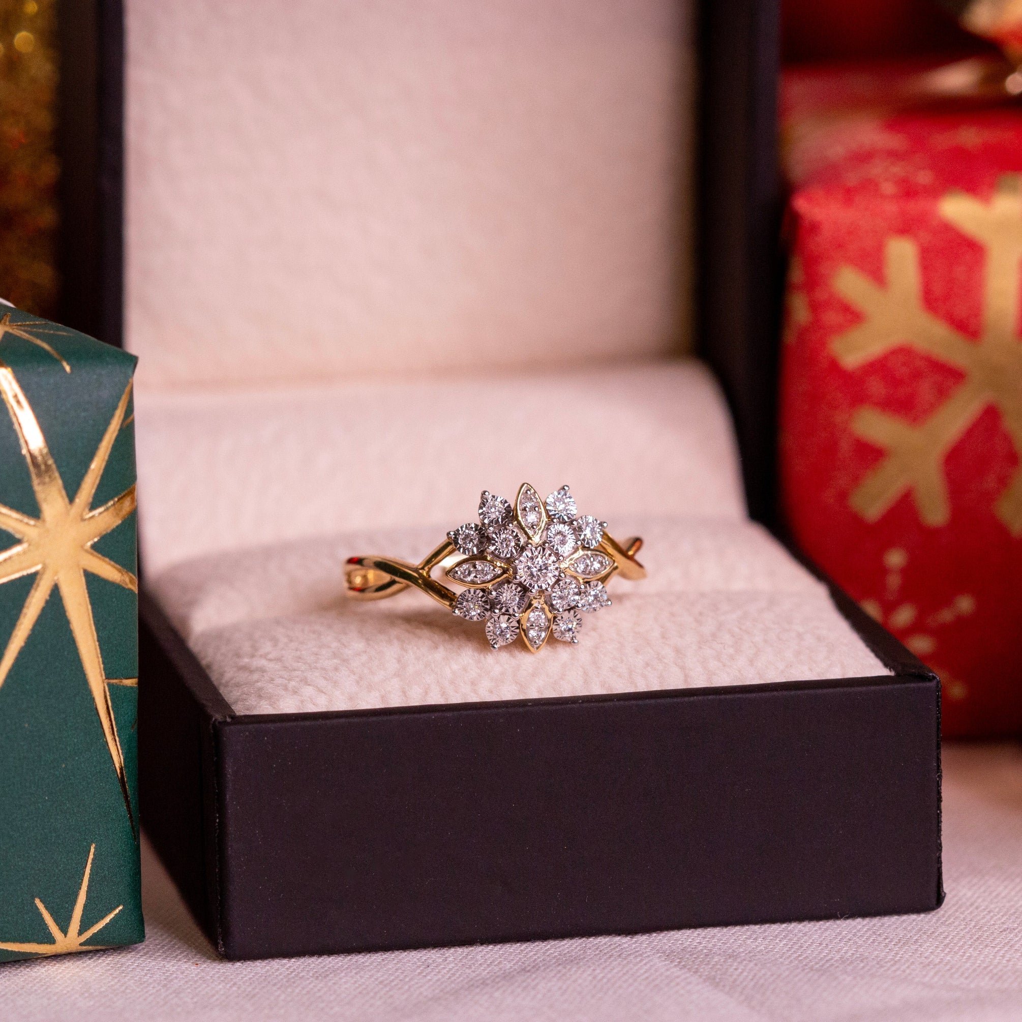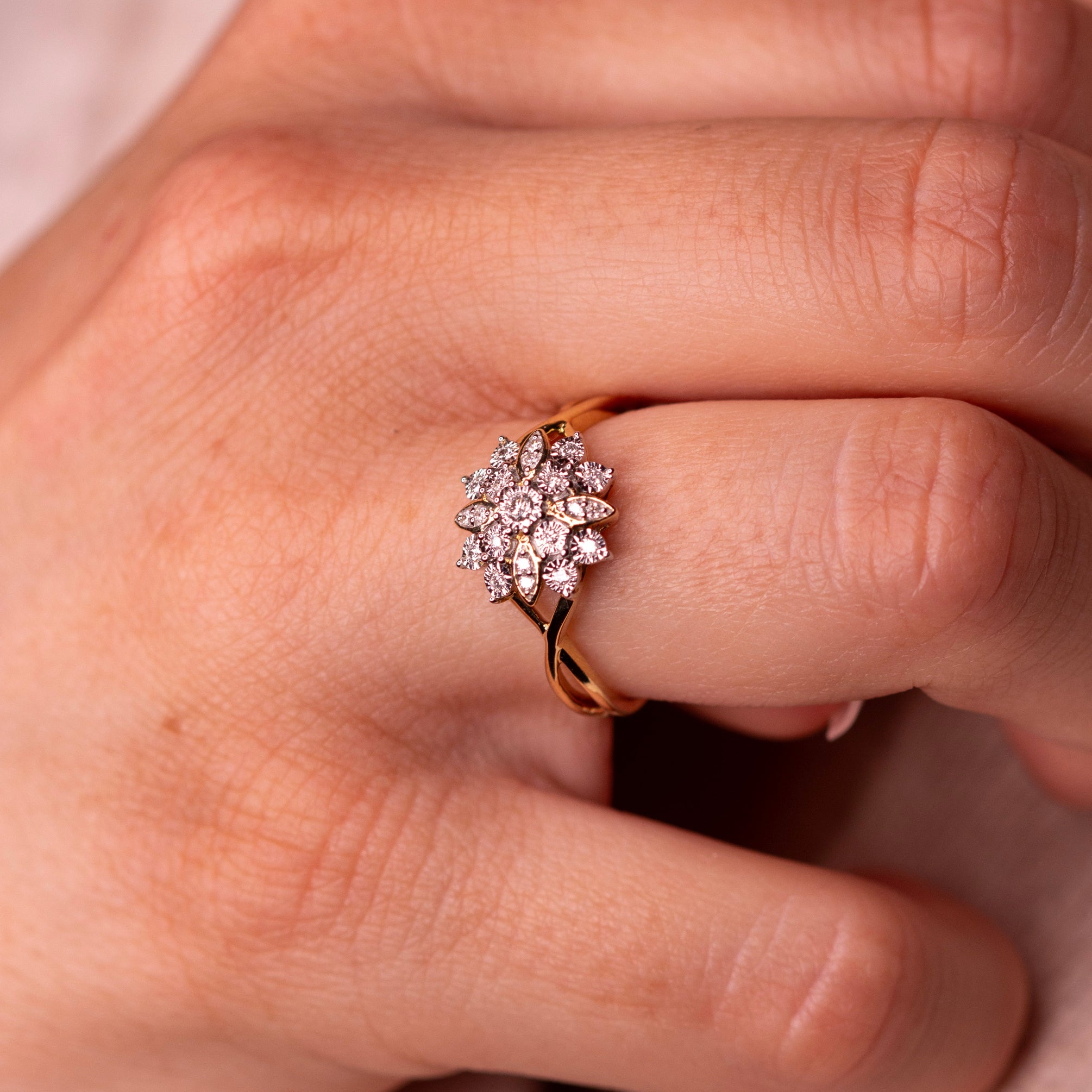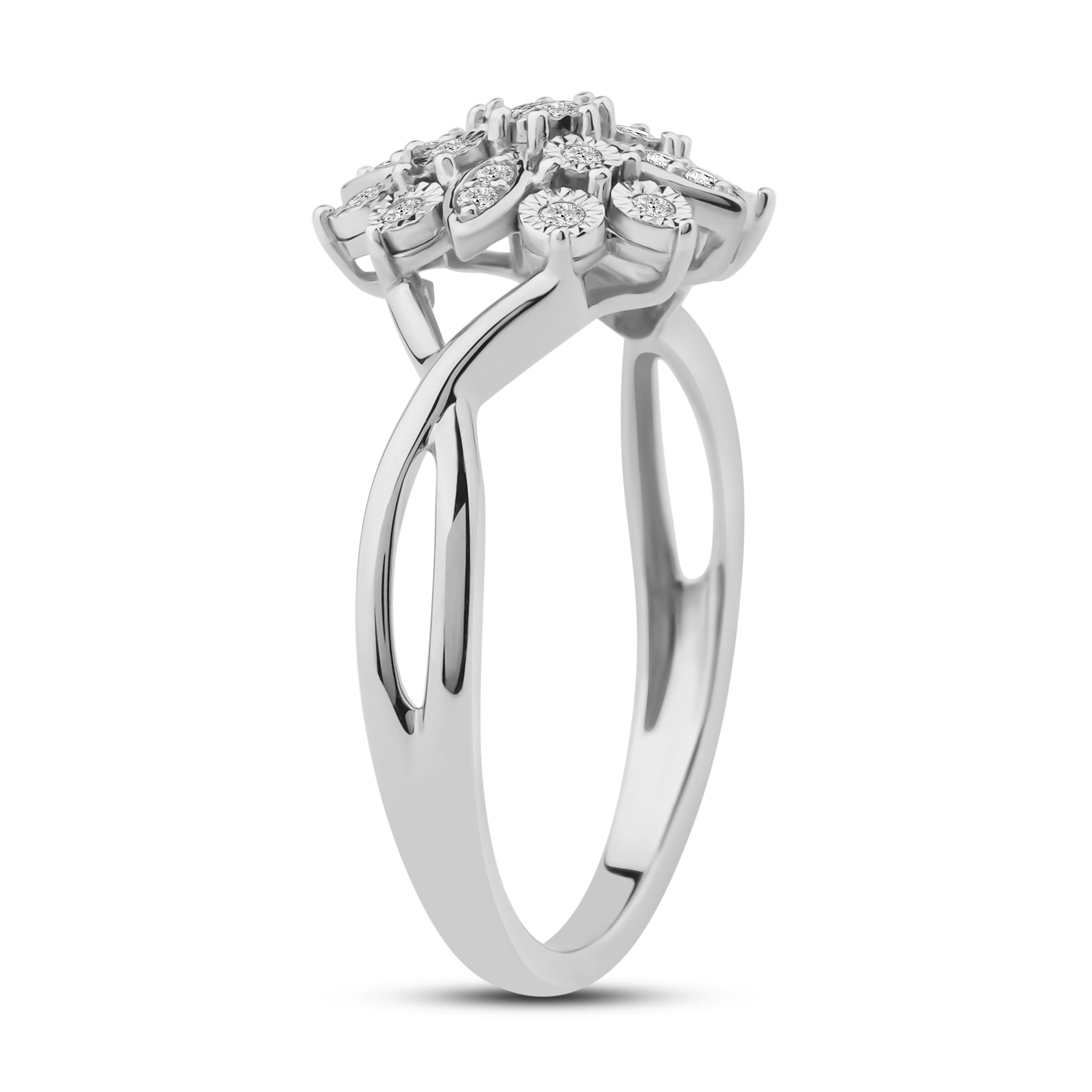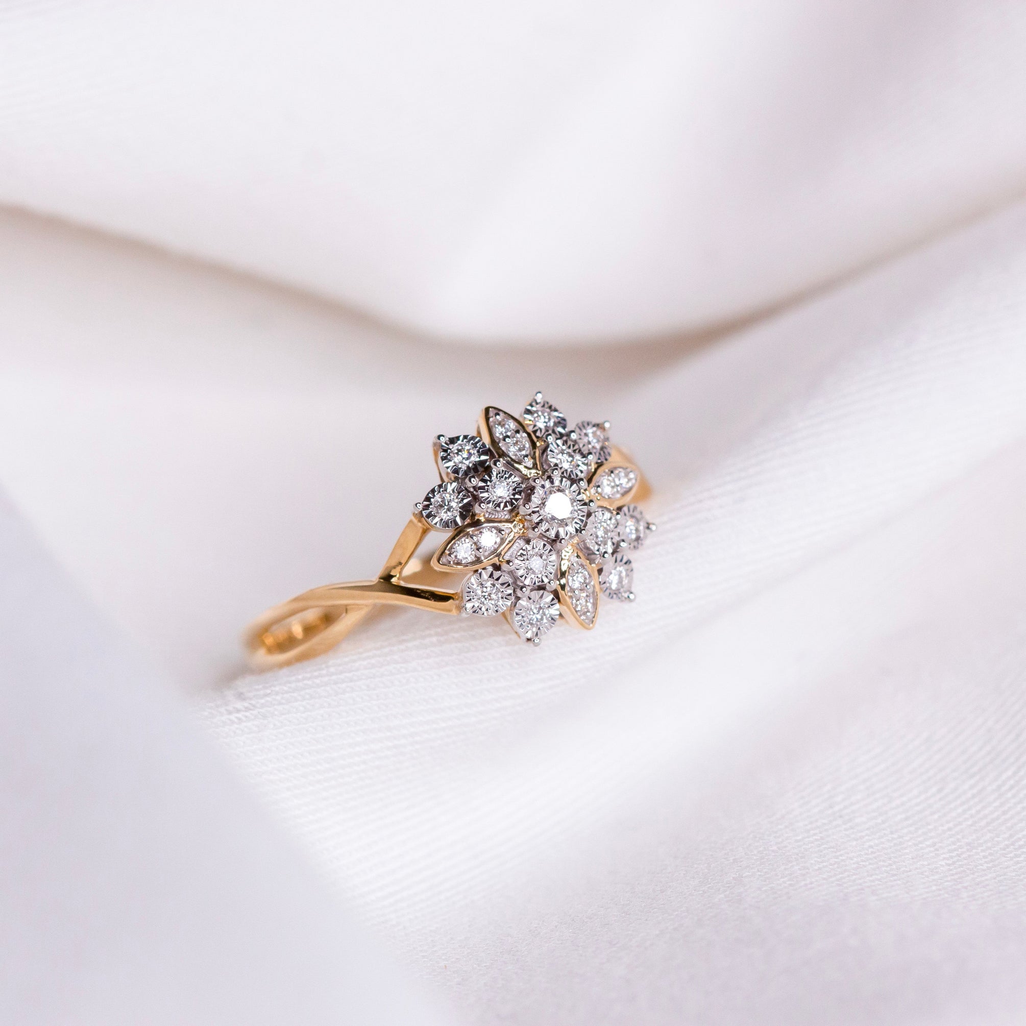 Praktfull diamantring i 14 kt gult eller hvitt gull, utsmykket med 0.16 ct TW/SI diamanter. Midtpartiet er designet som en blomsterkrone med en kombinasjon av runde og marquiseformede detaljer, alle besatt med glitrende diamanter. Den unike ringskinnen med delikat tvistet utforming gir ringen et ekstra preg av eleganse og særpreg.