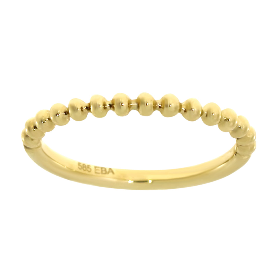 Tidløs ring i 14 karat gull med dekorative kuler som følger hele ringens overflate. Den enkle, men karakteristiske utformingen gir et moderne uttrykk med et hint av vintage-inspirasjon. Perfekt alene, men også nydelig å kombinere med andre ringer for en personlig stil. Et elegant tilskudd til smykkeskrinet – uten diamanter, men med tydelig karakter.