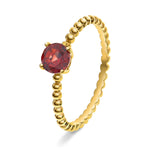 Klassisk ring i 14 karat gult gull, prydet med en dyp burgunderrød granat på 0.60 ct. Den mørke edelstenen gir et kraftfullt uttrykk som balanseres av ringens elegante form og detaljerte kulebånd. Kombinasjonen av varme toner og klar form gir smykket et eksklusivt preg. Et utvalg for den som søker noe med personlighet og dybde.