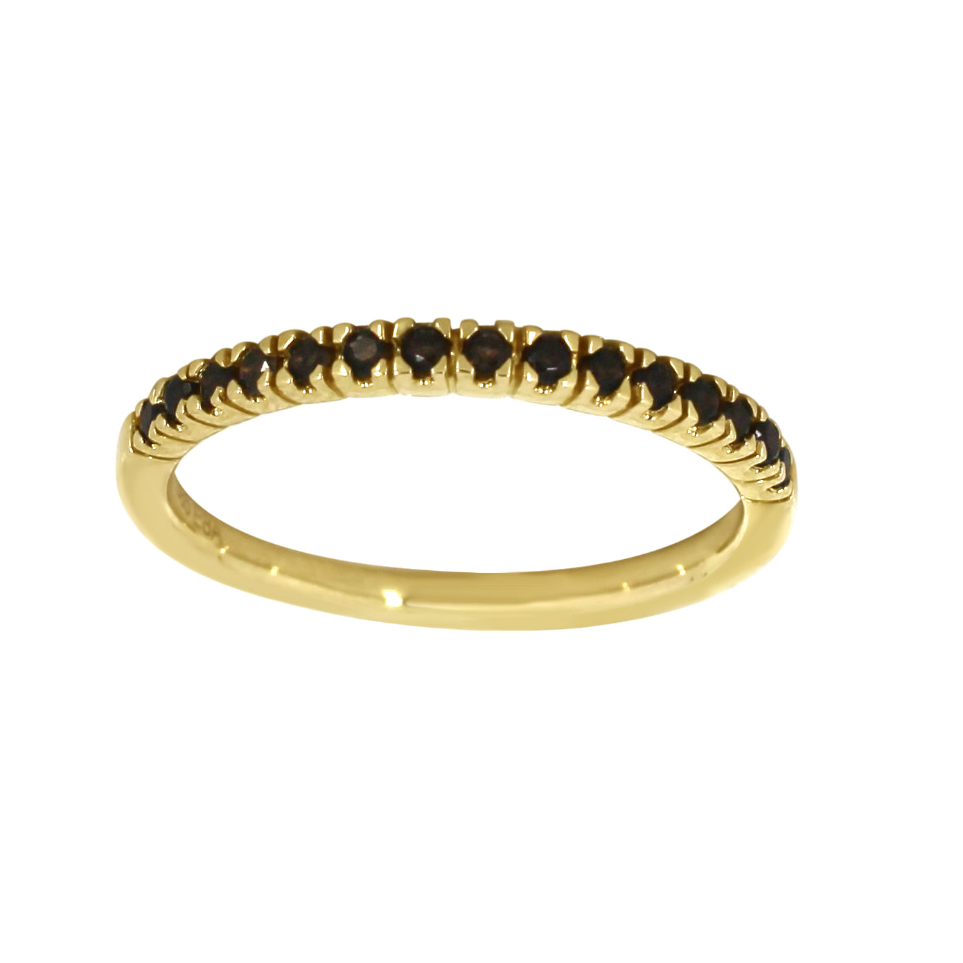 Stilren og elegant – denne allianseringen i skinnende gult gull er dekorert med røykkvarts på totalt 0.20 ct. De mørke stenene skaper en spennende kontrast mot det varme gullet, og gir smykket et sofistikert og tidløst uttrykk. Perfekt alene for et minimalistisk preg, eller kombinert med andre ringer for et mer personlig uttrykk.
