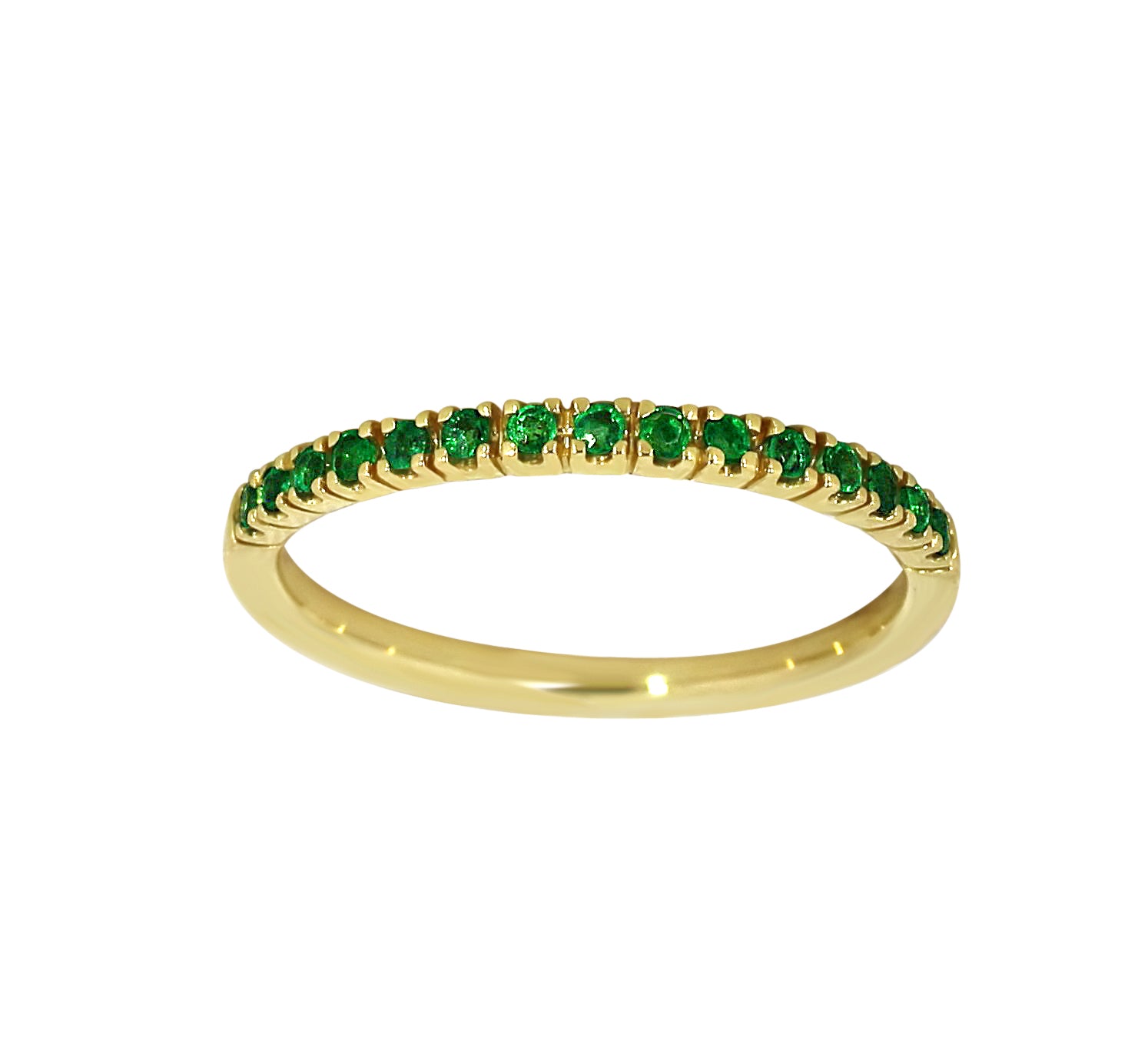 Elegant og iøynefallende – denne allianseringen i skinnende gult gull er prydet med naturlige dypgrønne smaragder på totalt 0.20 ct. De livlige grønntonene gir smykket et friskt og eksklusivt uttrykk, perfekt for deg som ønsker en tidløs detalj med et særpreg. Like vakker alene som sammen med andre ringer for et mer personlig uttrykk.