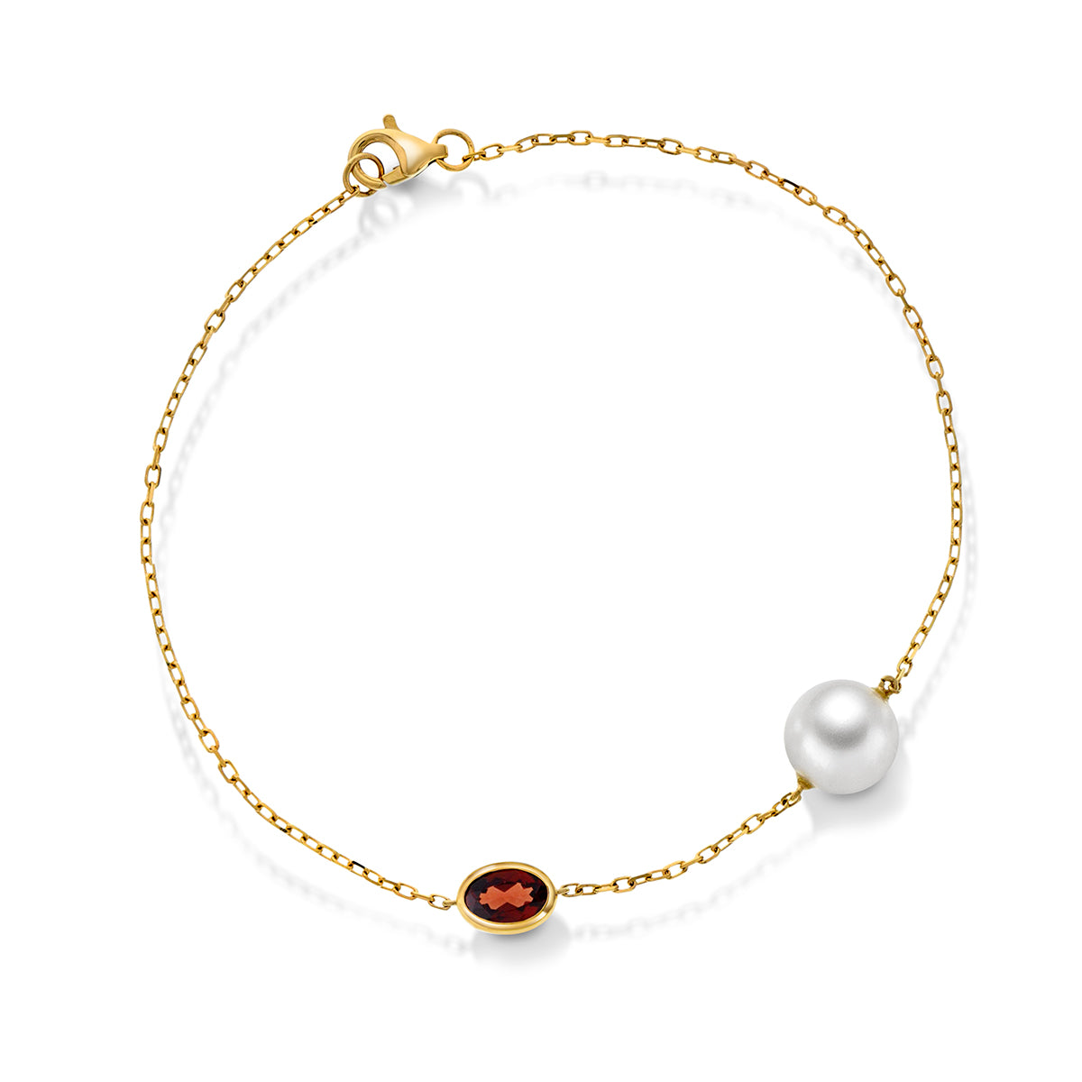 Sofistikert armbånd i 14 karat gult gull med en dyp rød granat på 0.55 ct og en 8 mm ferskvannsperle. Granaten gir et intenst og raffinert fargespill som kompletteres av perlens silkemyke overflate og gullens varme glød. Det lette kjedet gir smykket et moderne og delikat preg.