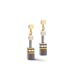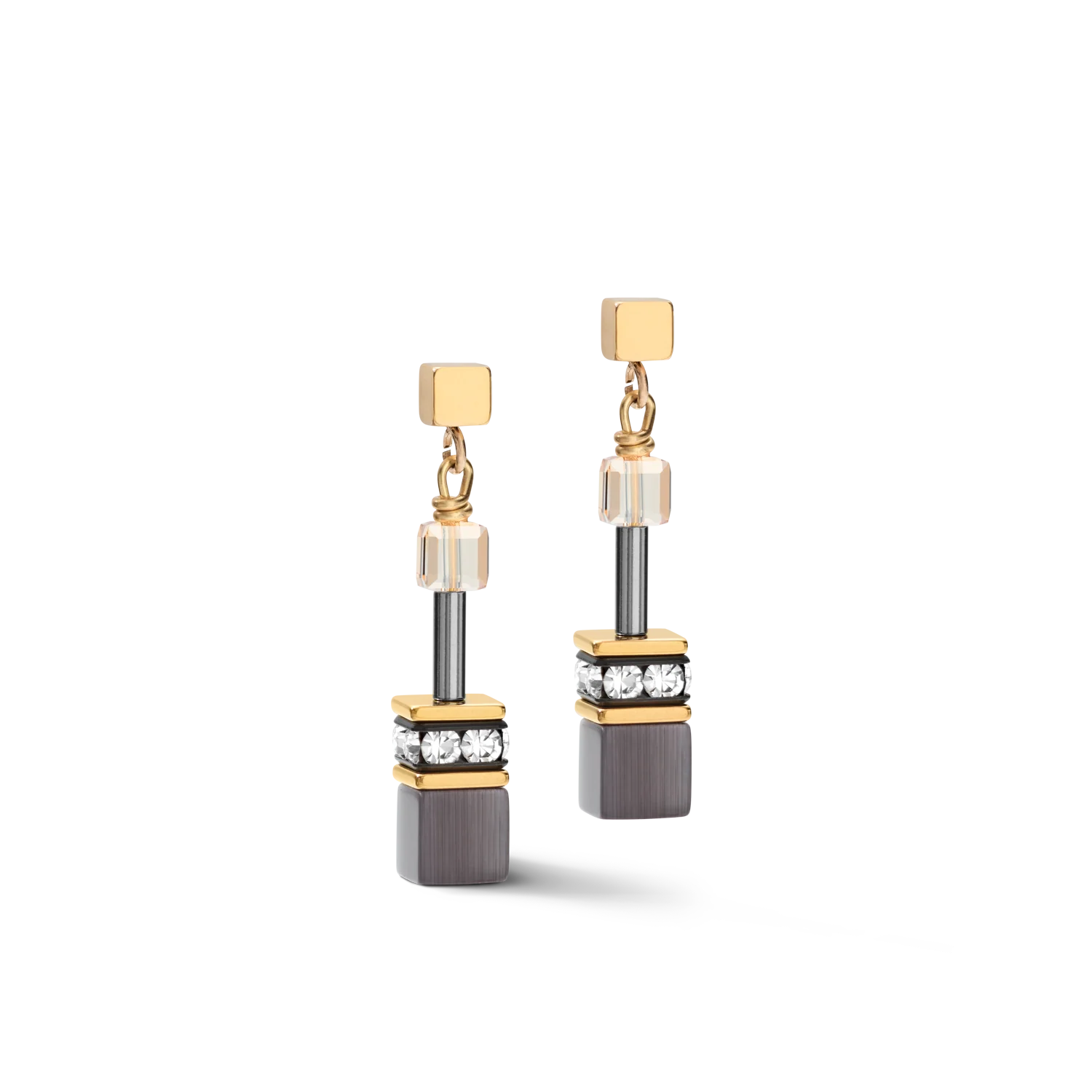 Ørepynt fra Coeur de Lion, hentet fra den ikoniske GeoCUBE®-kolleksjonen, utført i edelstål med gullforgylte detaljer og et elegant, hengende uttrykk. Kubeformede elementer i dempede gråtoner kombineres med klare krystallpartier og glitrende Swarovski®-krystaller, som gir smykket et raffinert spill mellom matte overflater og diskret glans. Den slanke, vertikale oppbygningen gir en lett bevegelse og fremhever Coeur de Lions karakteristiske signatur, der presisjon og materialvalg står i sentrum.