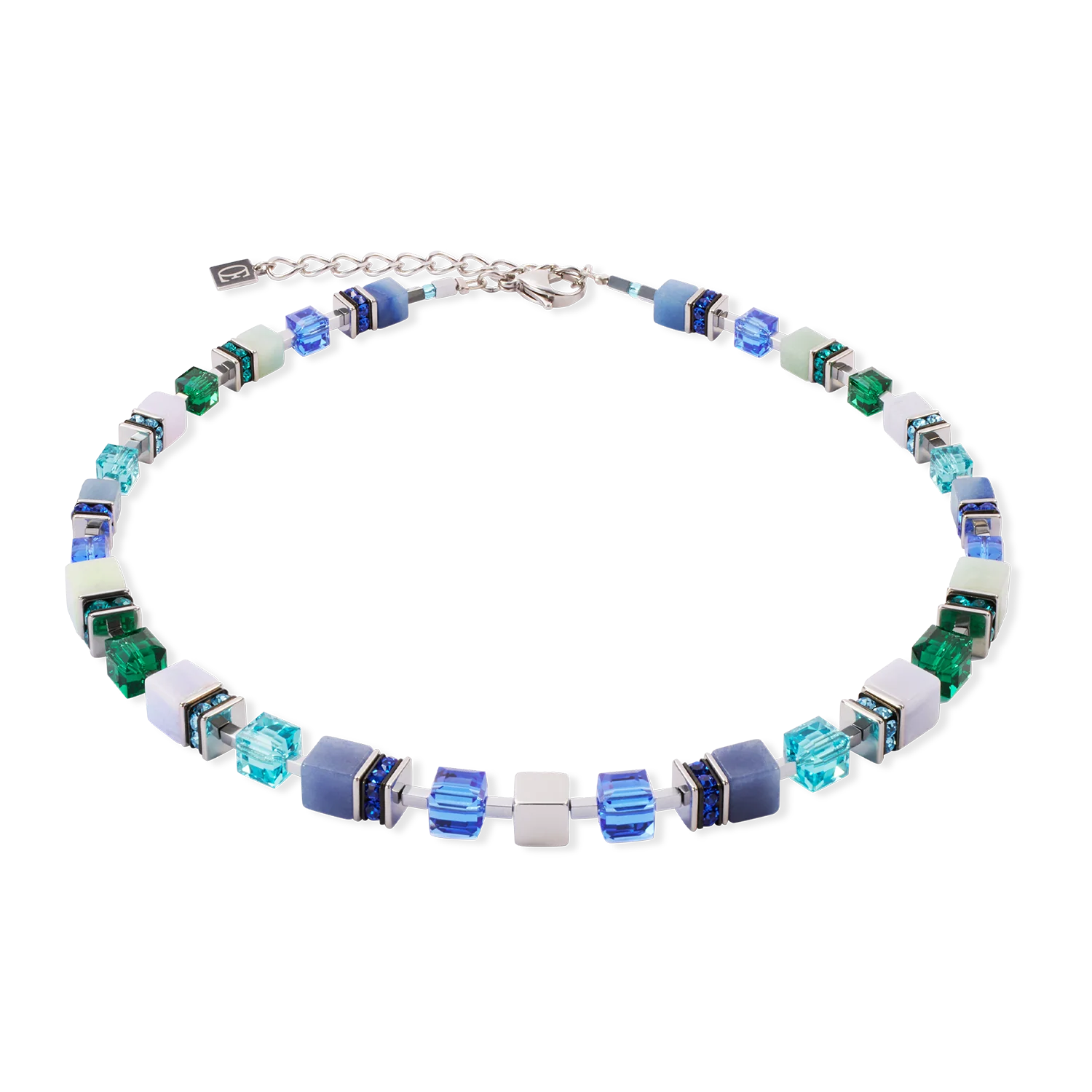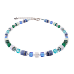 Halssmykke fra Coeur de Lion, hentet fra den ikoniske GeoCUBE®-kolleksjonen, utført i edelstål og designet med kubeformede elementer i en balansert palett av kjølige blåtoner, friskt grønt og myke, lyse nyanser. Utvalgte edelstener kombineres med fasetterte Swarovski®-krystaller som gir smykket dybde og et levende fargespill, mens rhinestone-detaljer tilfører en subtil glans. Det presise, geometriske uttrykket understreker merkets signaturstil, der form, farge og materialvalg smelter sammen i en gjennomført helhet.