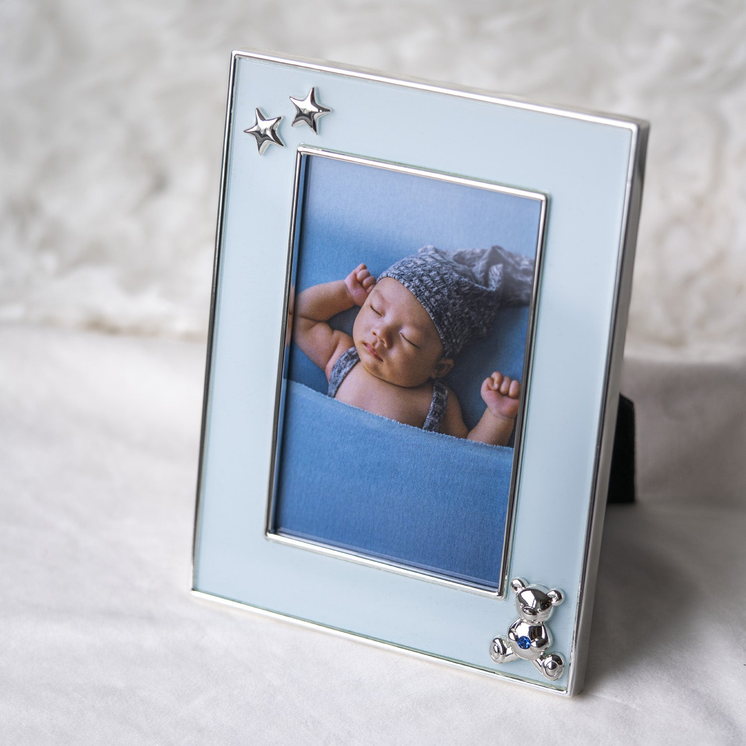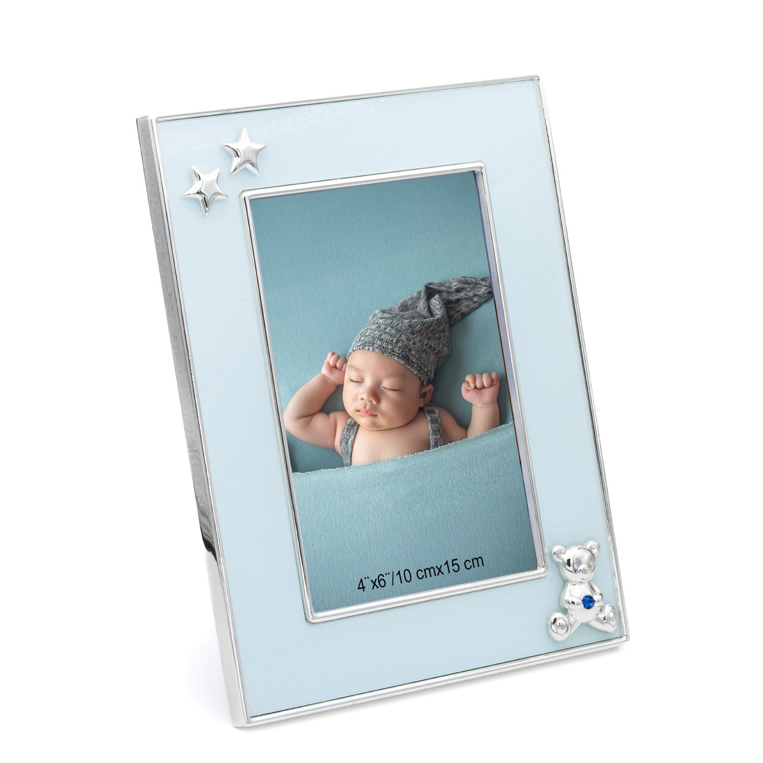 Fotoramme i forsølvet sink med lakkert overflate, designet med en lysblå front og små detaljer som stjerner og en liten bamse som gir et mykt og sjarmerende uttrykk. Den blanke sølvfinishen skaper en elegant kontrast mot den duse blåfargen, mens den glatte lakken sørger for at rammen holder sin fine glans over tid. Størrelsen passer perfekt til et bilde på 10 x 15 cm, og bakstativet gjør den enkel å plassere på kommode, hylle eller nattbord.