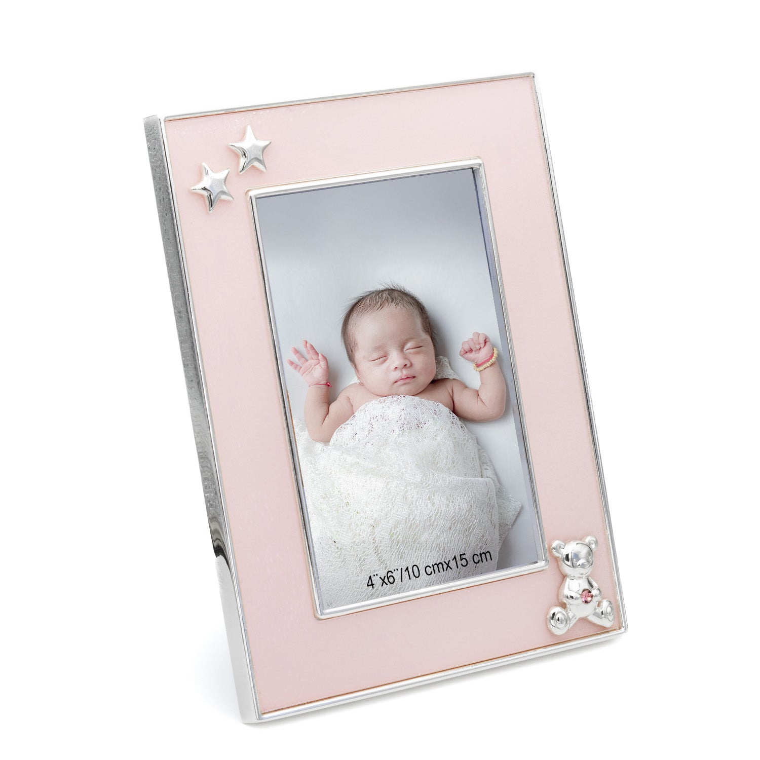 Fotoramme i forsølvet sink med lakkert overflate, designet med en dus rosa front og små detaljer som stjerner og en liten bamse som gir et mykt og sjarmerende uttrykk. Den blanke sølvfinishen skaper en elegant kontrast mot den varme rosatonen, mens den glatte lakken sørger for at rammen beholder sin fine glans over tid. Størrelsen passer et bilde på 10 x 15 cm, og bakstativet gjør den enkel å plassere på kommode, hylle eller nattbord.